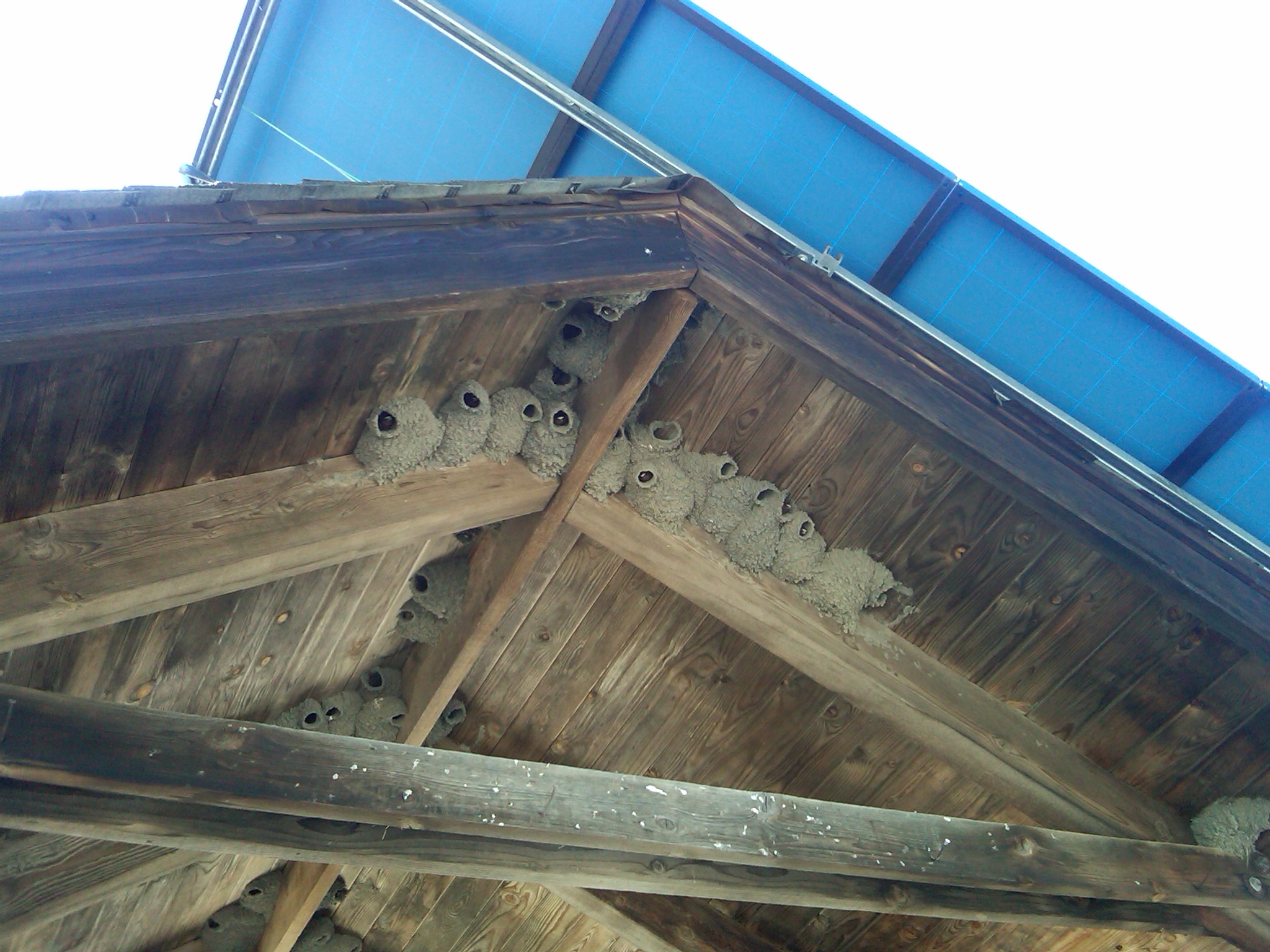 Swallows nesting under the solar panels–you can see little heads in some of the nests