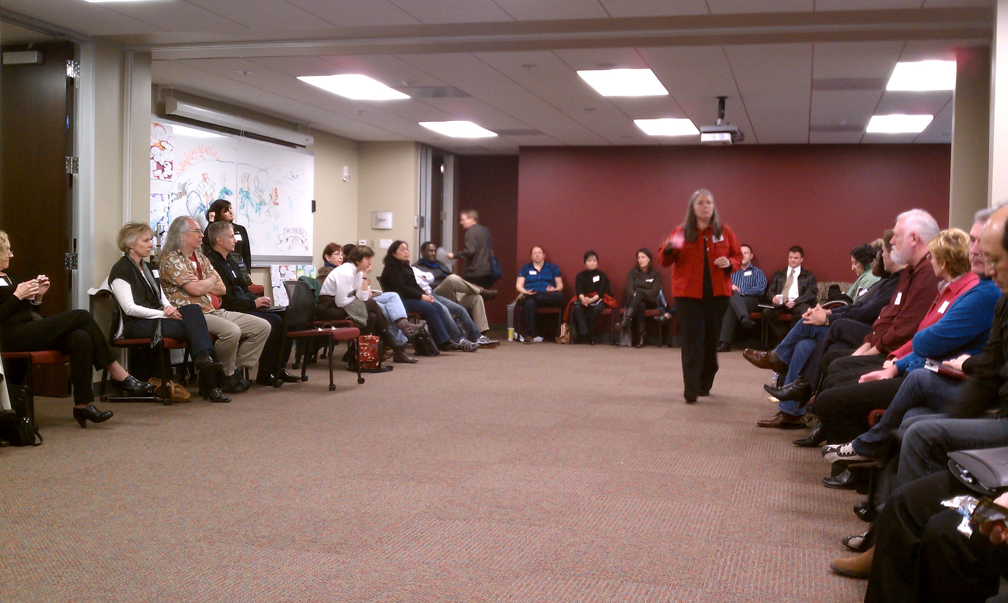 Like many of the attendees, I didn’t know what to expect — and I admit to having felt some misgivings when the facilitator, Ainsley Nies, had us all sit in a circle as she walked around the inside explaining how the day would proceed. Anyone could come up with a topic, announce it, and post its title and location; then we’d all peruse the topics and decide which sessions we’d like to attend. Once in the session, the facilitator (usually the person who’d proposed the topic) would be responsible for keeping the discussion going and taking notes. Beyond that, anything could happen.