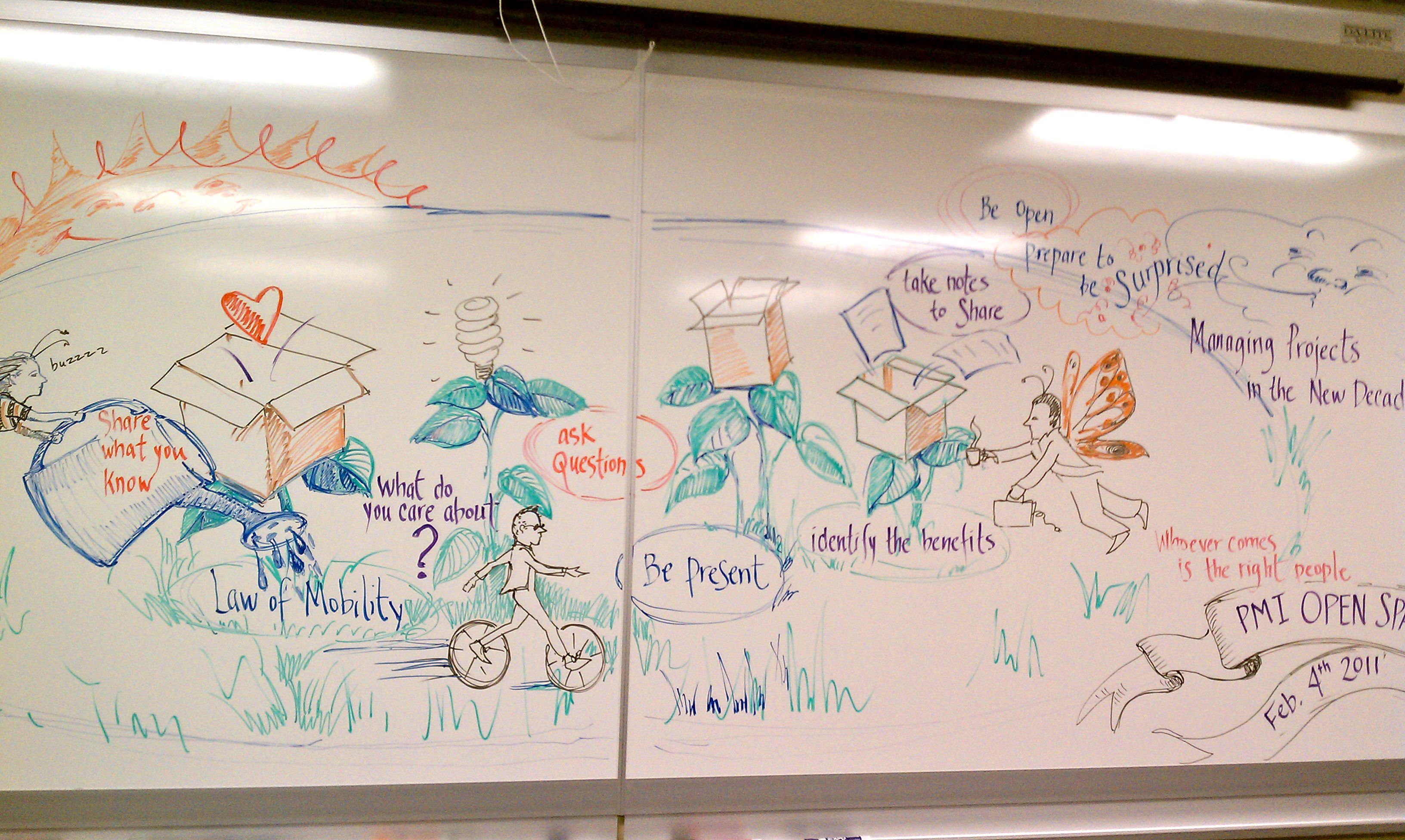 When most people hear the term “open space,” they think of a green area in or near a city, a place set aside for our enjoyment of nature and to give us a breather from the city’s density. But in the world of project management it’s come to have an entirely new meaning: an open space, in this sense, is a self-organized meeting or event without an initial agenda, and with just on rule, the Law of Mobility and Responsibility (a.k.a. the Law of Two Feet): “If you are not learning or contributing where you are, find a place where you can learn or contribute.” An open space also follows these four principles: