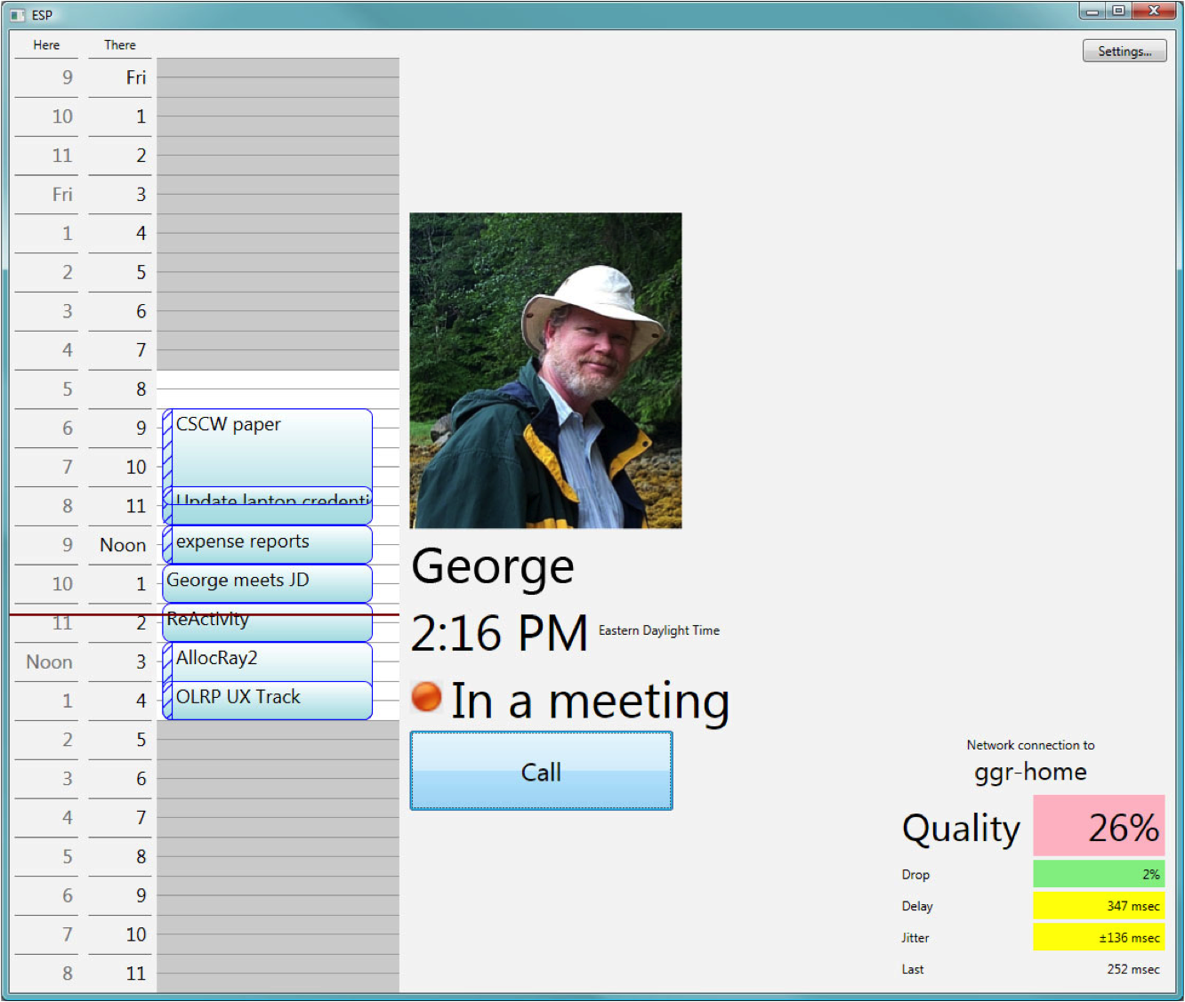 When the employee is not at their ESP, a default display can be kept on that shows basic status and availability information, such as whether the employee is on vacation or in a meeting, or what the weather is where they are. The information is kept abstract enough so as not to feel invasive. And keeping the ESP on helps increase the presence of the employee in the group.