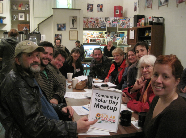 Just some of the 15 solar enthusiasts gathered at Farley’s Cafe in San Francisco last weekend. Thanks to Kristina Shih of Solar Mosaic for this photo.