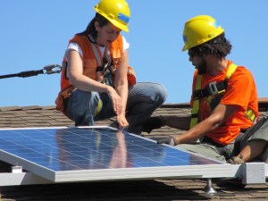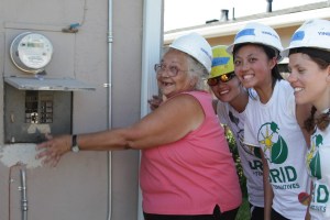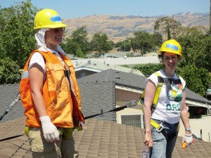 I was part of the Women’s Build, which installed a mere 9 panels for our super-energy-efficient homeowner, Lilli, pictured here in the green shirt (and yes, there is a man in the photo — one of the volunteer team leads). Luckily, we didn’t have to turn her power off for long to install the system, because as Lilli informed us, she can’t live for very long without Facebook. Here’s a rundown of what we accomplished with just these 9 panels: